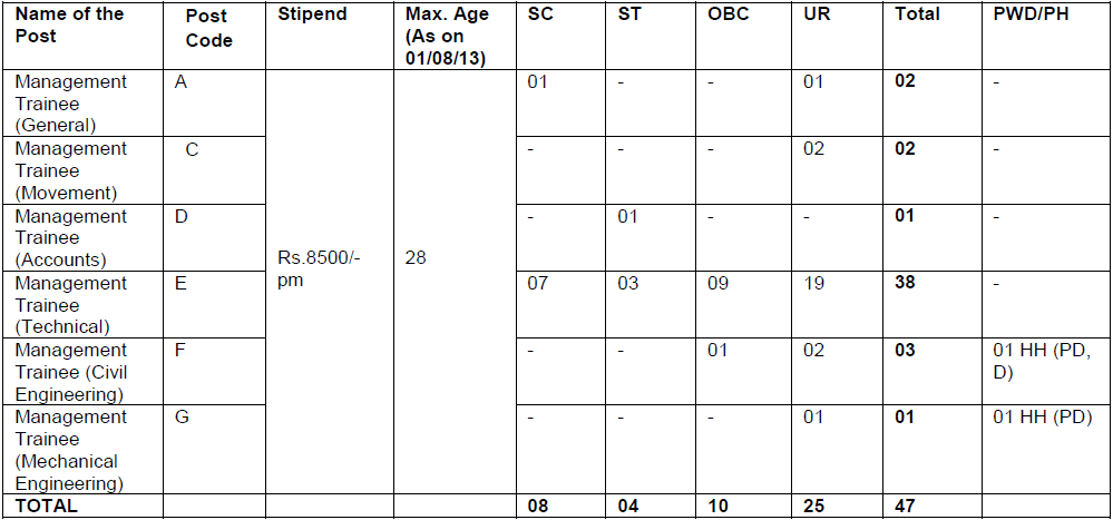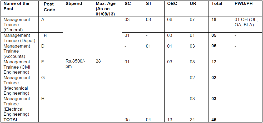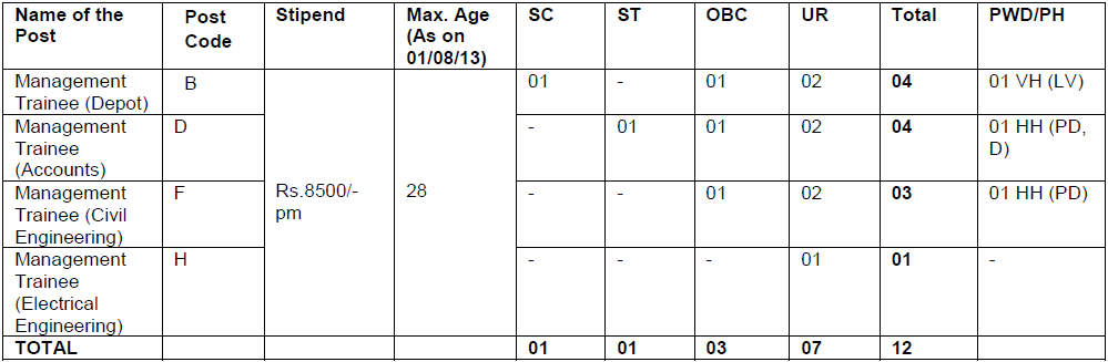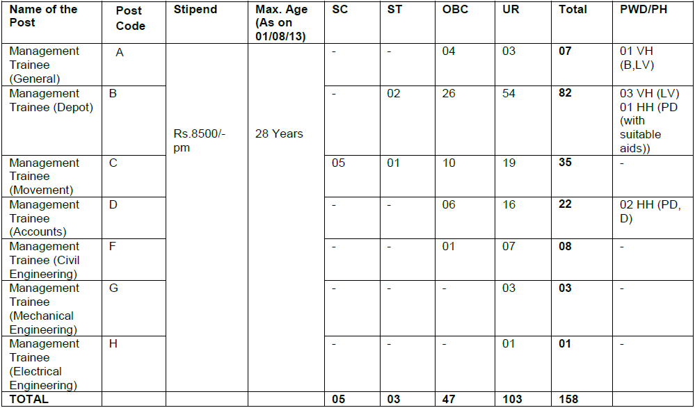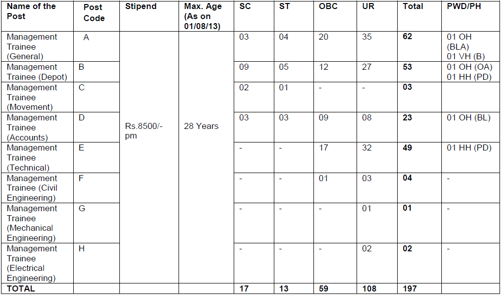 - Management Trainee (General), Management Trainee (Depot), Management Trainee (Movement): Graduate degree or equivalent from recognized University with minimum 60% marks or CA/ICWA/CS.