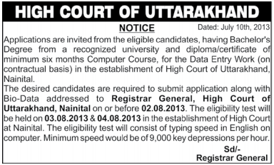 Applications are invited from the eligible candidates, having Bachelor’s Degree from a recognized university and diploma/certificate of minimum six months Computer Course, for the Data Entry Work (on contractual basis) in the establishment of High Court of Uttarakhand, Nainital.